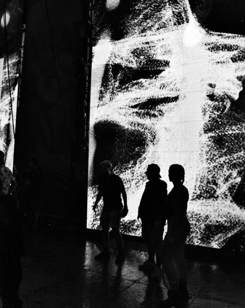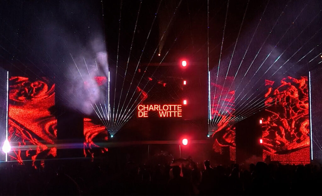 Audioreactive realtime visuals developed and performed live in TouchDesigner, adapted to the tempo and energy of each act. Acts include Charlotte de Witte, Peggy Gou, Amelie Lens, and Marco Carola.